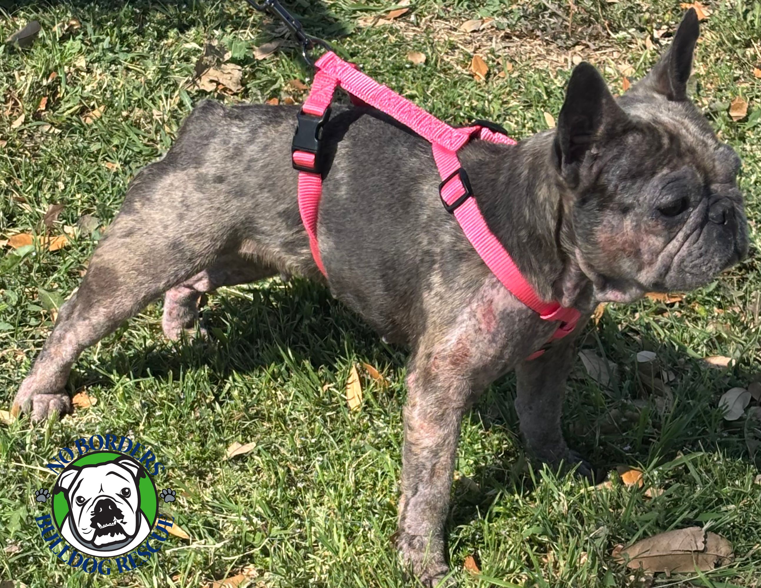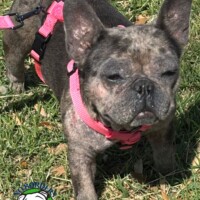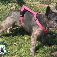 Gabriela is a 3 year old female Frenchie we call Gabby. She has never met a stranger. She is so affectionate and full of love for anyone she meets. When she was first fostered 2 weeks ago, her skin irritations were at its peak and she had scratched so much under neck that she no longer had any hair! She would not get any quality of sleep due to constant scratching. It has been less than 2 weeks on her skin medication, and along with dermatologic shampoo baths, and the right food she is rarely scratching now 🙂 She is now on a limited ingredient beef, rice & sweet potato diet….no chicken for Frenchies 🙂