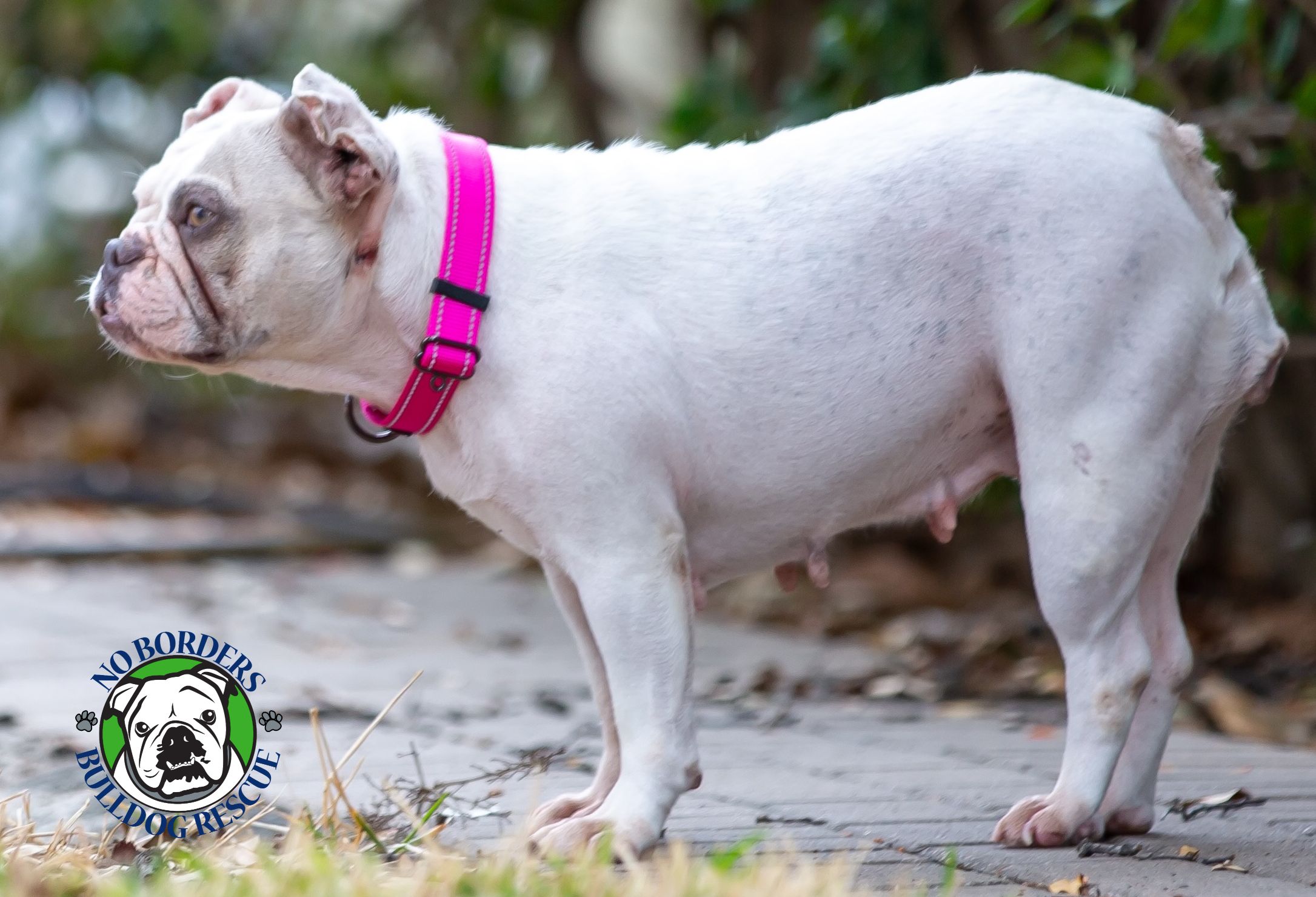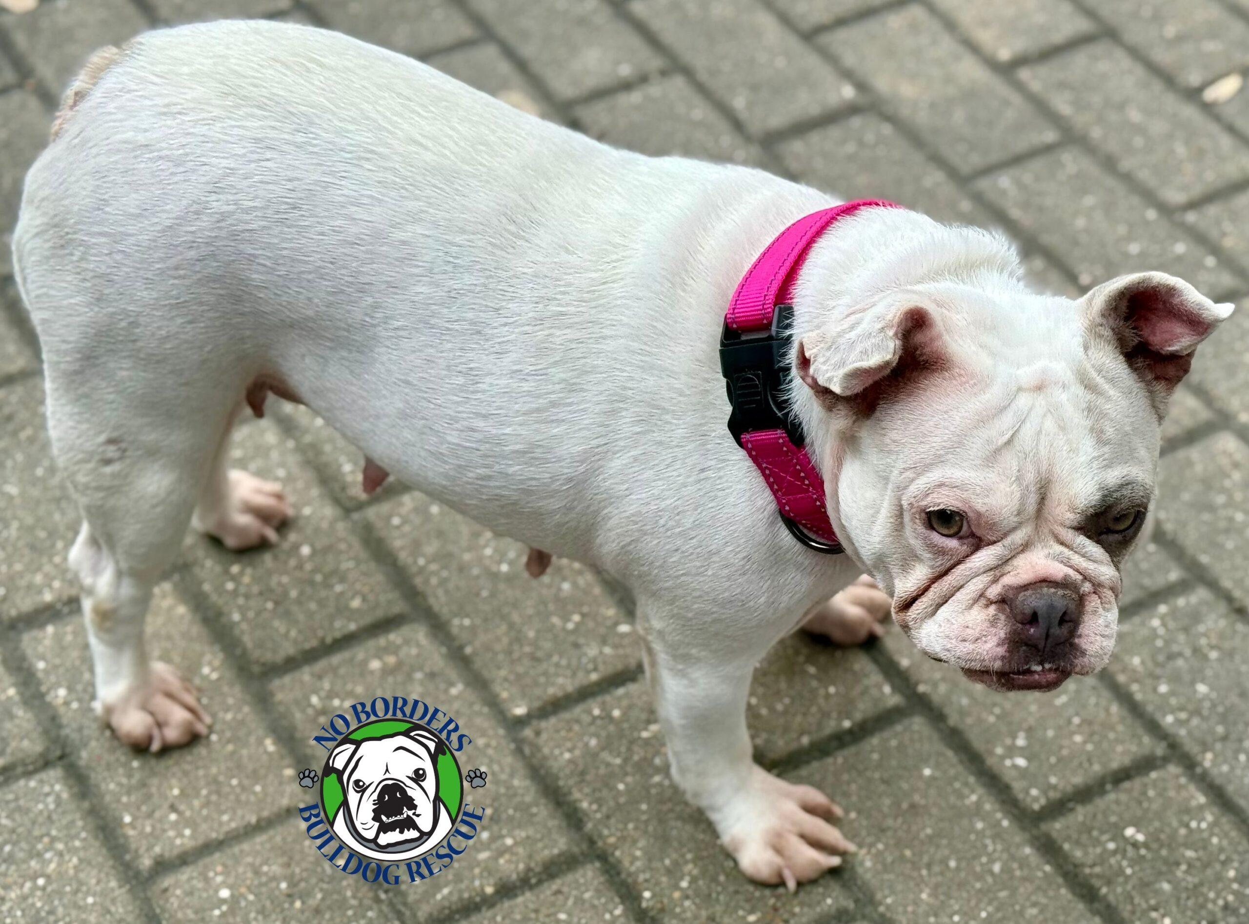 Willow joins the No Borders Bulldog Rescue by way of owner surrender.  Willow and her brother Walter are a bonded pair that have had a bumpy life lately. Prior to September their history is almost non-existent. They were purchased as a set by a local family after they lost their previous Frenchie. They were told one story and found that the most of that information was incorrect.   After many trips to the vet the family decided that they were not able to care for Willow and Walter any longer. They contacted NBBR and asked if we could take them in and find them a home (together).   For those not “in the know” with Rescue these days, finding qualified foster homes has become VERY difficult and that is for ONE dog.  To find a home that could handle not one but TWO is even more difficult.  BUT we did have a family that had previously adopted from us and had just completed an application to adopt again.   However, ideally, they wanted ONE English Bulldog as that was what they always had.   Well, as a hail Mary, we contacted them to ask…. after hearing about Willow and Walter their only question was “When will they be arriving”? The ONE English request had morphed into TWO Frenchies in a matter of minutes.  But if you think about it, it’s kinda the same amount of dog (in poundage), just two packages instead of one.